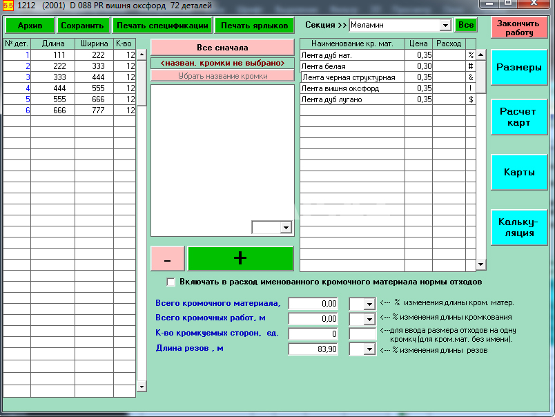 - Печать нескольких видов спецификаций деталей, (в т.ч. с указание схемы кромочных работ);