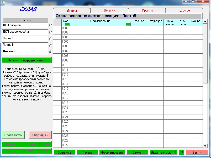 - Склад основных листов, остатков, кромочного материала, комплектующих/фурнитуры, работ и услуг;