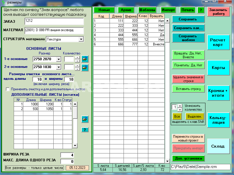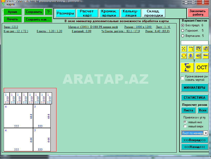 - Составлене оптимизирванных карт раскроя (3-и варианта за один сеанс), включая расчет обьема раскроечных работ (в м пог.);