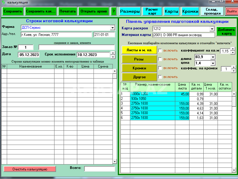 - Автоматизированных расчет стоимости заказа (включая основной материал, порезку, кромочный материал, комплектующие, фурнитуру, услуги и т.п.)