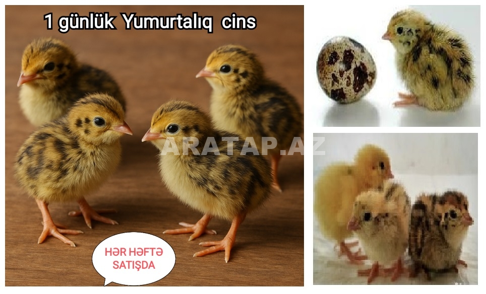 Kürtyatan Jumbo Bildirçin cücələri. Yumurtalıq cins 45-ci gündən başlayaraq illik 330-dək yumurta verimi. Hər həftə çıxış olur. Ən azı 100 ədəd Satılır. Qiymət = 40 qəpik Texas Ətlik cins Bildirçin cücələri. 30+ gündə 150+ qram təmiz ət verimi. illik 300-dək yumurta verimi. Sifarişlə çıxarılır. Qiymət = 50 qəpik