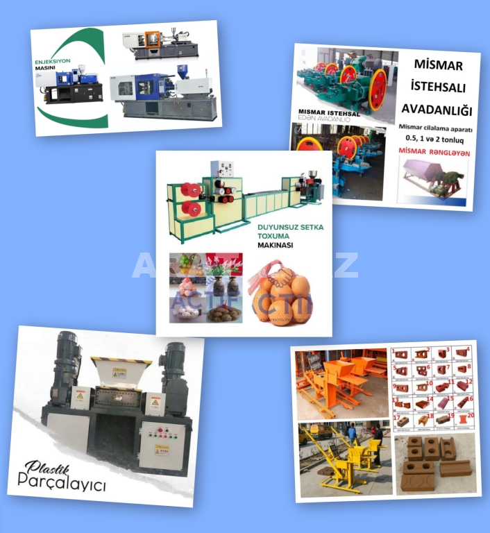 Enjeksiyon maşını. Hər növ Enjeksion Makina gətirilmə və tərəfimizdən quraşdırılması. Model: HDX50. Çəkisi: 55 ton. Qiyməti: 47.600 ₼ ● PLASTİK PARÇALAYICI. İstehsal gücü: 500-1500 kq. 2 motorlu. 24 bıçaqlı. Çəkisi: 1 ton ● PARÇA. KİSƏ Didən, Doğrayan makina. Parçanı, kisəni xırda xırda doğrayan, parçalayır ● SETKA TOXUYAN düyünsüz makina. Saatda: 20-35 kq toxuyur. Enerji sərfiyyatı: 38 Kw. Bakıda quraşdırılma və təhvil 51.000 ₼ ● BAXİL istehsal edən aparat. 100-130 ədəd/dəqiqədə. Qiyməti: 25.500 ₼ ● DƏMİR. Uqolnik. Profil Kəsən və üzərində müxtəlif formalı deşik açan avadanlıqlar ● KATİNKA və ARMATURU Düzləşdirən avadanlıq ● Müxtəlif ölçülü TRUBA və PROFİLİ dərəcə üzrə və arka formasında əyən makina ● KÖMÜR istehsal edən avadanlıq. OPILKA. FINDIQ. QOZ qabığından ● LAZER ilə kəsən və birka vuran. Dəmir və s. məhsulları Lazer şüası ilə kəsən və Dəmir məhsulların üzərinə logo və dirgər məlumatları Lazerlə yazan makina ● PLASTİK KƏMƏR bağlama makinası. Zaryadaka ilə işləyir. Böyük və kiçik bağlamaları kip bağlamaq üçün Sifarişlə gətirilir. Qiymətlər Bakıda təhvil qiymətidir. Alıcı gömrük qeydiyyatını özü həyata keçirərsə daha ucuz başa gələr. Ətraflı məlumat üçün WhatsApp